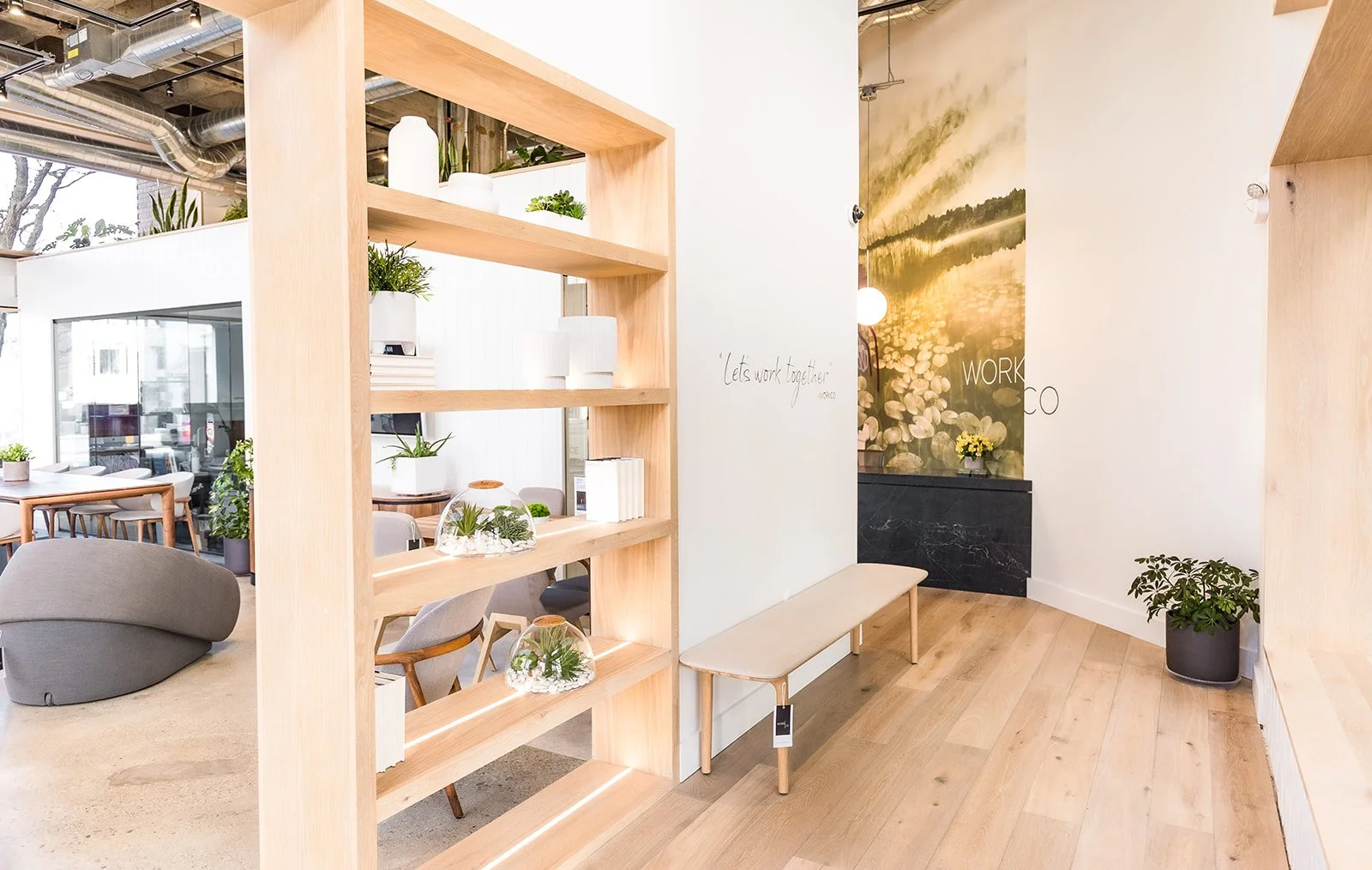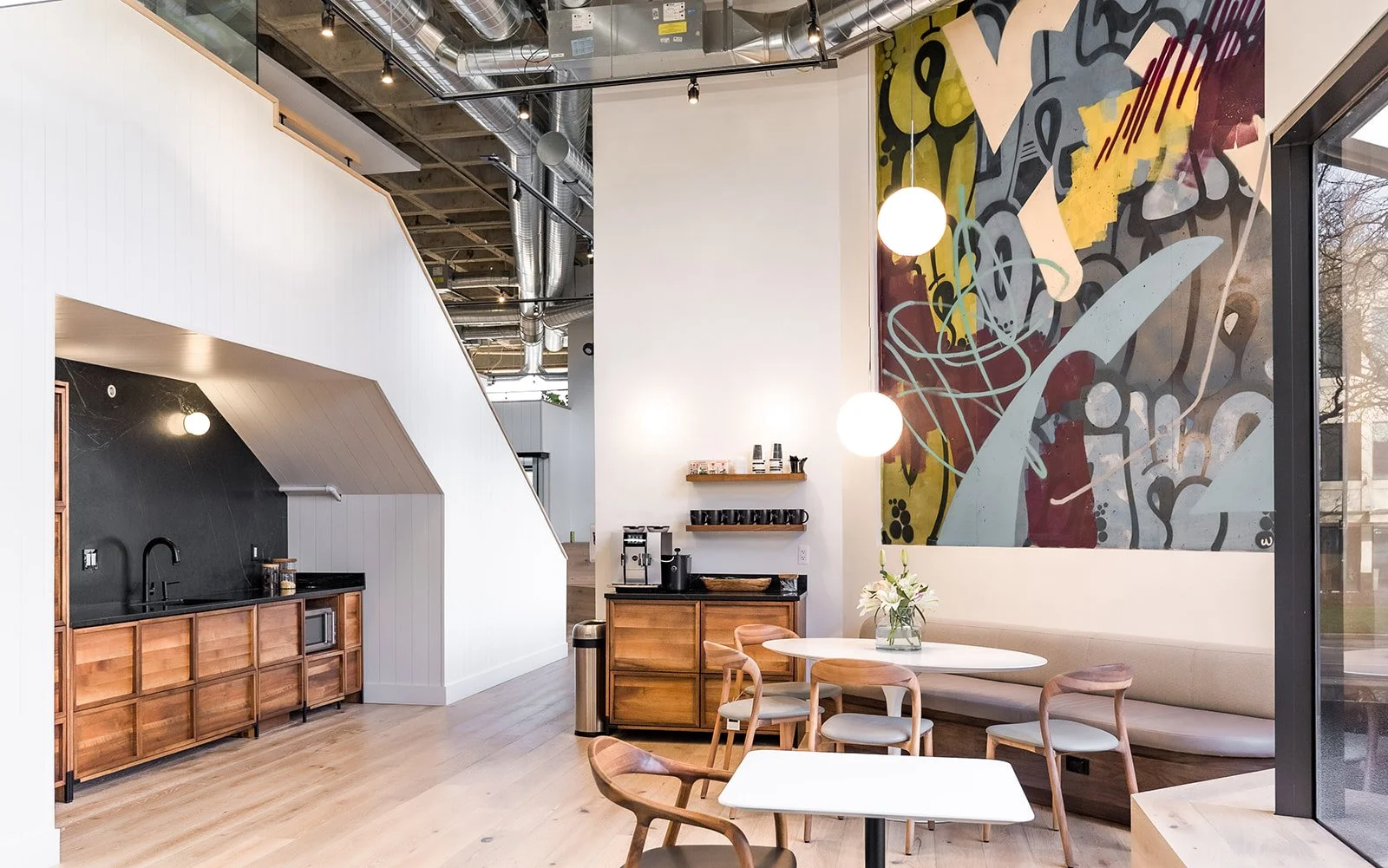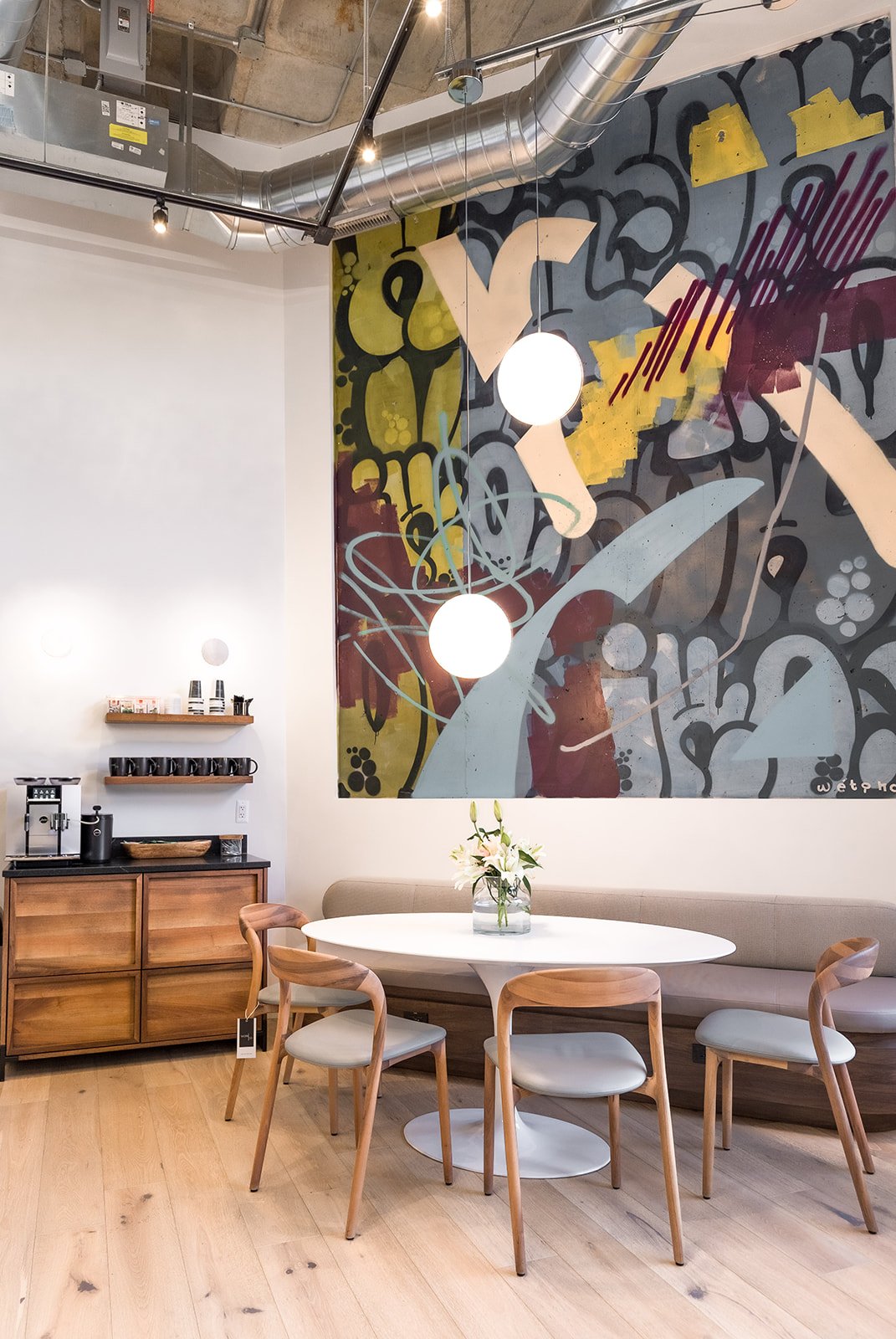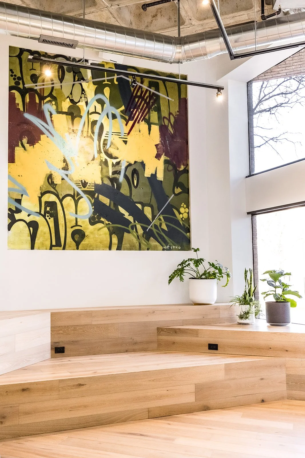 Work Co in Birmingham, Michigan selected Wetiko to combine the dynamic nature of graffiti and serenity of impressionist styling into one cohesive space. The merging of Work Co’s clean yet inviting spaces along with its industrial and Scandinavian aesthetic bring unique elements to this co-working business space.